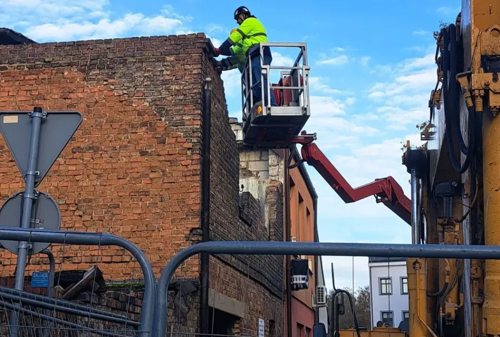 Ręczna rozbiórka kamienicy w gęstej zabudowie mieszkalnej Szamotuł z ograniczonymi możliwościami użycia ciężkiego sprzętu.